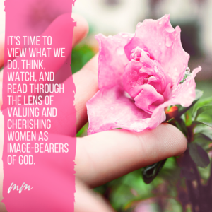 It’s time to view what we do, think, watch, and read through the lens of VALUING and CHERISHING women as image-bearers of God. We must take an intentional, penetrating look at what we allow into our homes, families, thoughts, and lives.